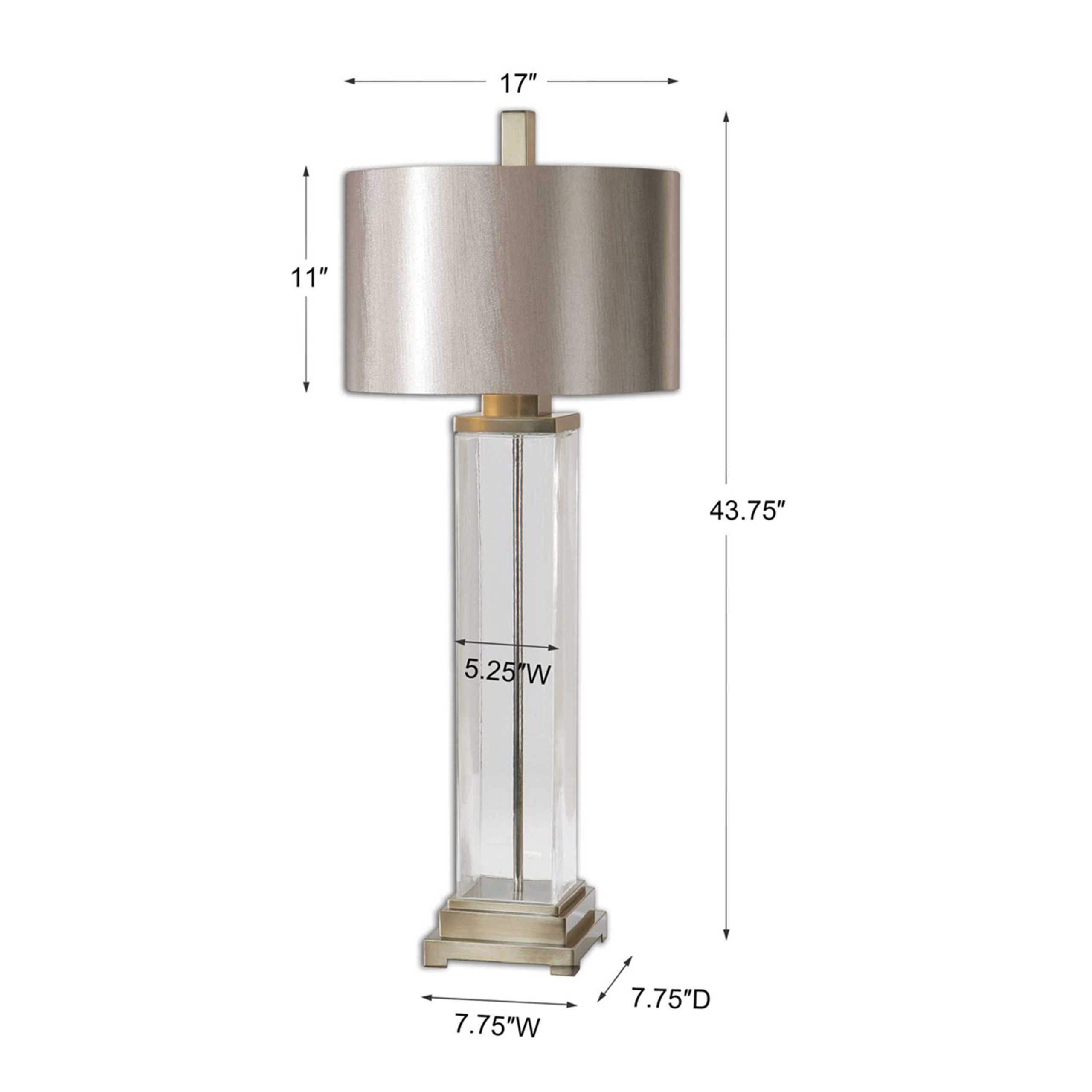Cristal transparente grueso acentuado con detalles chapados en champán cepillado.
