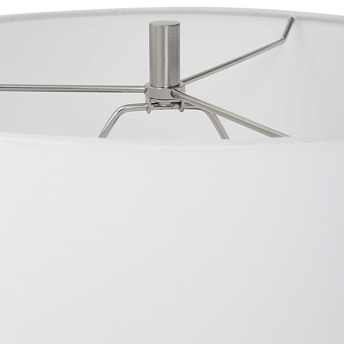 Esta lámpara cerámica con rayas vidriadas de cobalto, toscamente talladas y llamativas con marfil contrastante, acentuadas con detalles de níquel cepillado.